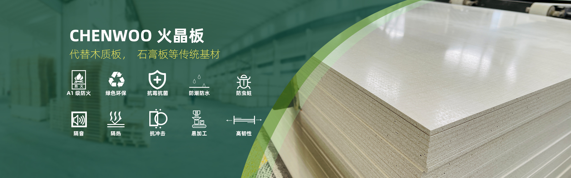 本公司生產的無機火晶板在兼并現有有機板材的各項性能的同時,具有燃燒性能A1級,安全環保,耐水防潮,防蟲防害,保溫隔熱,隔音降噪,易加工,握釘力強等優越特性,是取代傳統木質板材、石膏板的無憂選擇。 【查看詳情】