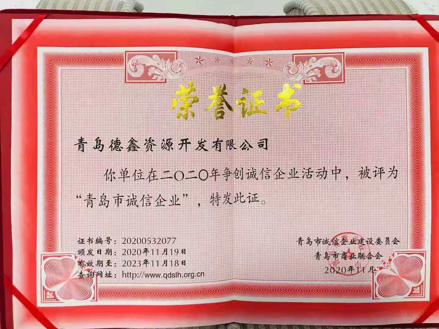 青島德鑫資源開發(fā)有限公司在2020年?duì)巹?chuàng)誠信企業(yè)活動(dòng)中,被評(píng)為“青島市誠信企業(yè)”