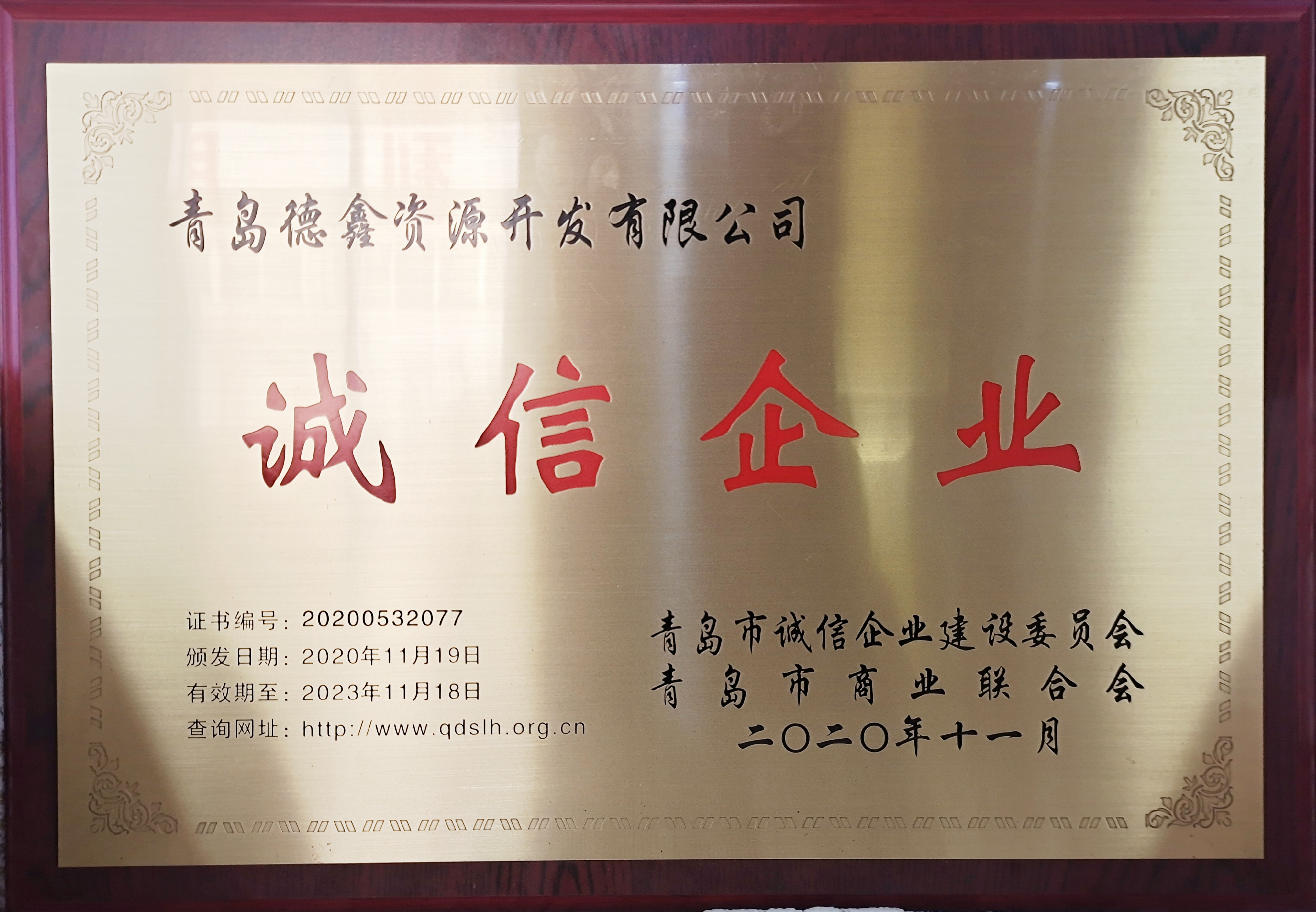 青島德鑫資源開發(fā)有限公司評(píng)為“青島市誠信企業(yè)”